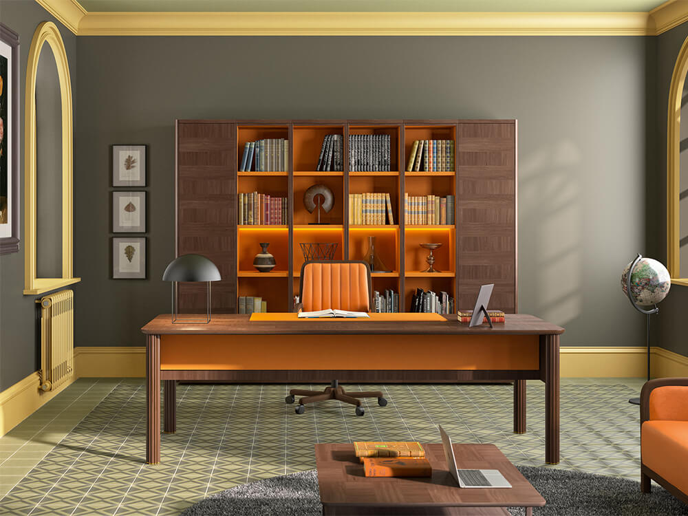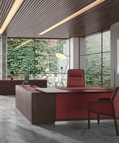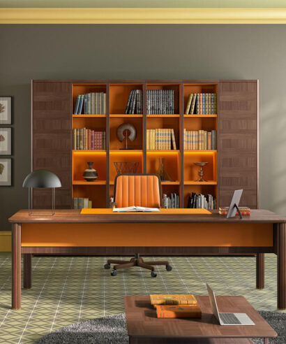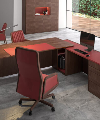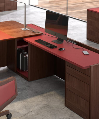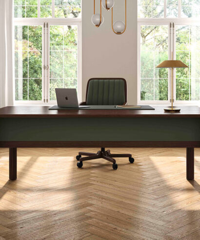 • Legs: The legs are made of 20 mm thick 675 Kg/m3 MDF fibre board and natural Mukali veneer, framed by two columns in beech wood in Art Deco style. These columnsare arranged with a hollow for the descent of cables that is practicable thanks to specific magnets in them. On the upper side of the leg, there is a small recess between the leg and the top so that the cables can pass to the lower cable tray.