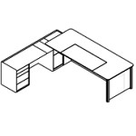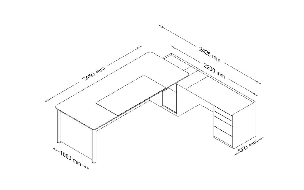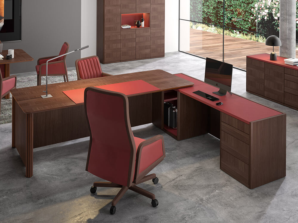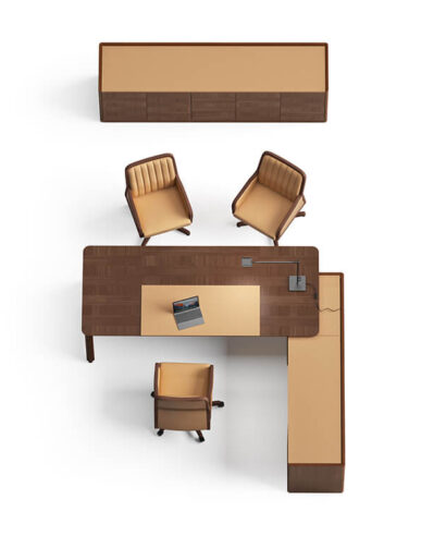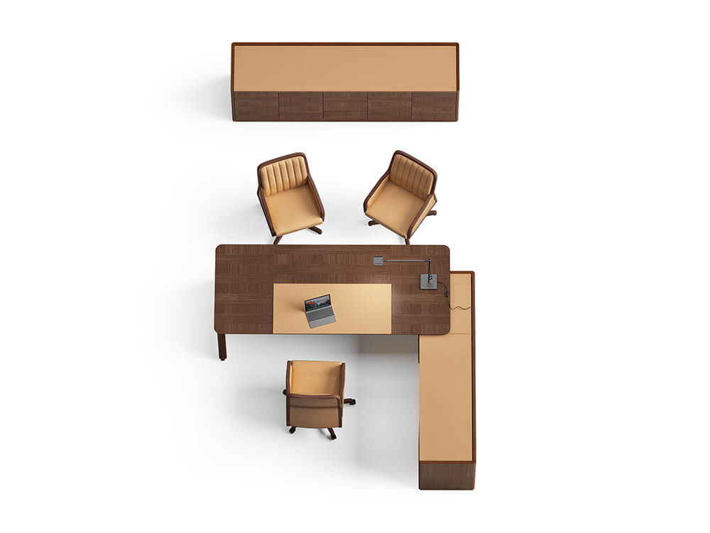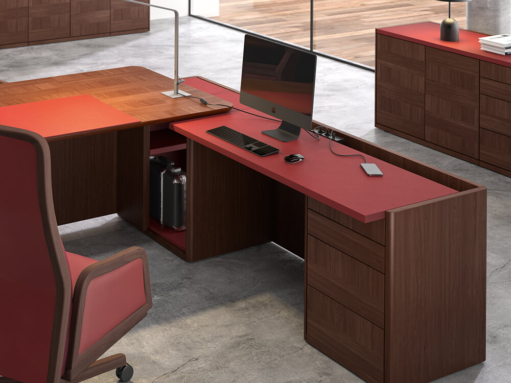 • Return Pedestal: With a sliding top, allowing access to electrifications, and upholstered in full grain leather in any of our different finishes, provided with a small cabinet with a shelf at the bottom of the table and a drawer, and 4 drawers at the opposite side.