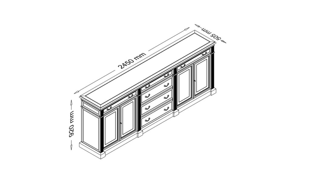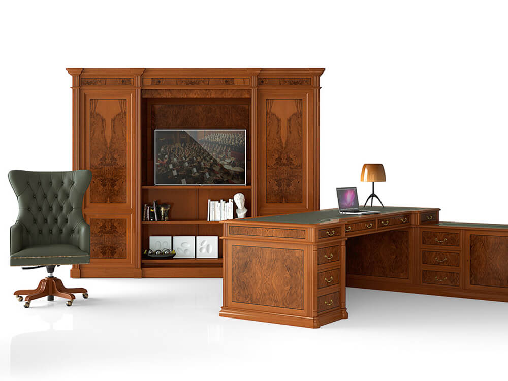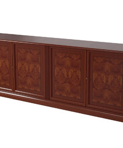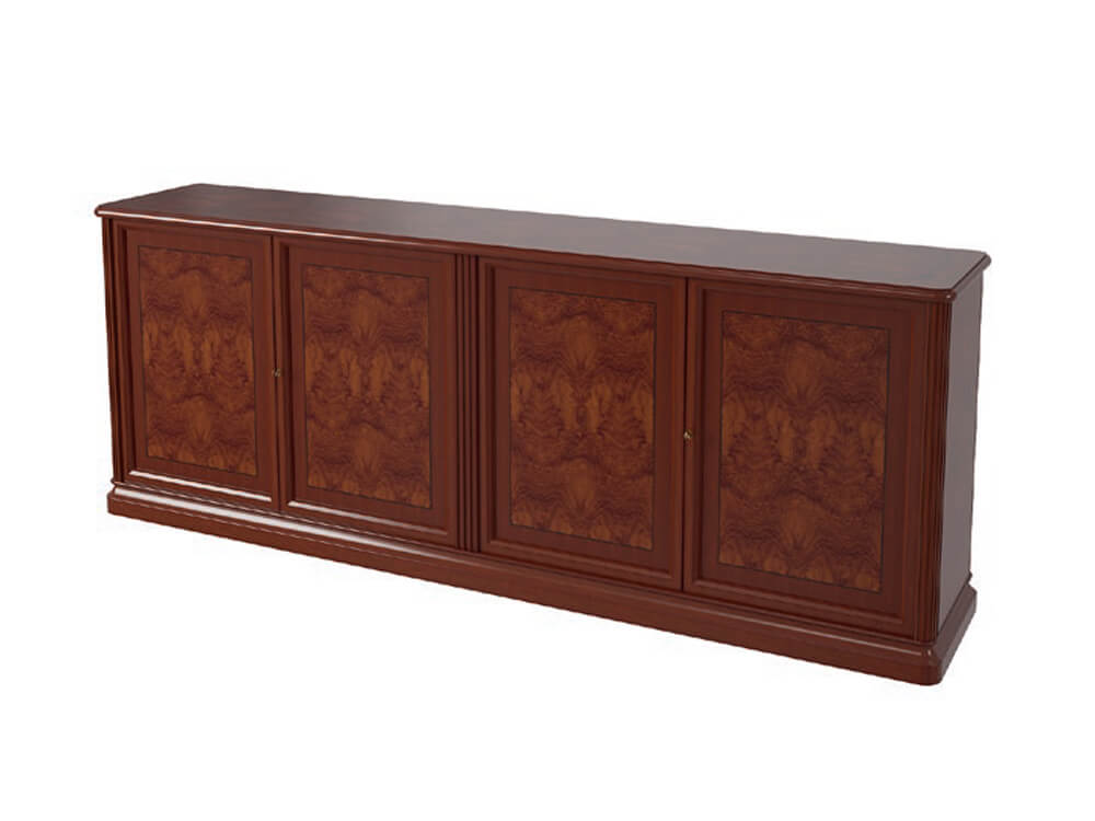 • Doors: Cabinet doors are made with 8 mm thick 700 kg/m3 MDP fibre board framed in beech wood, all covered in 0.5 mm natural cherry veneer with black tinted boj veneer inlay framing the central panels in ash olive veneer. The door hinges and keys are made of Zamak and finished in old gold. Iron locks with external rod studs finished in old gold.