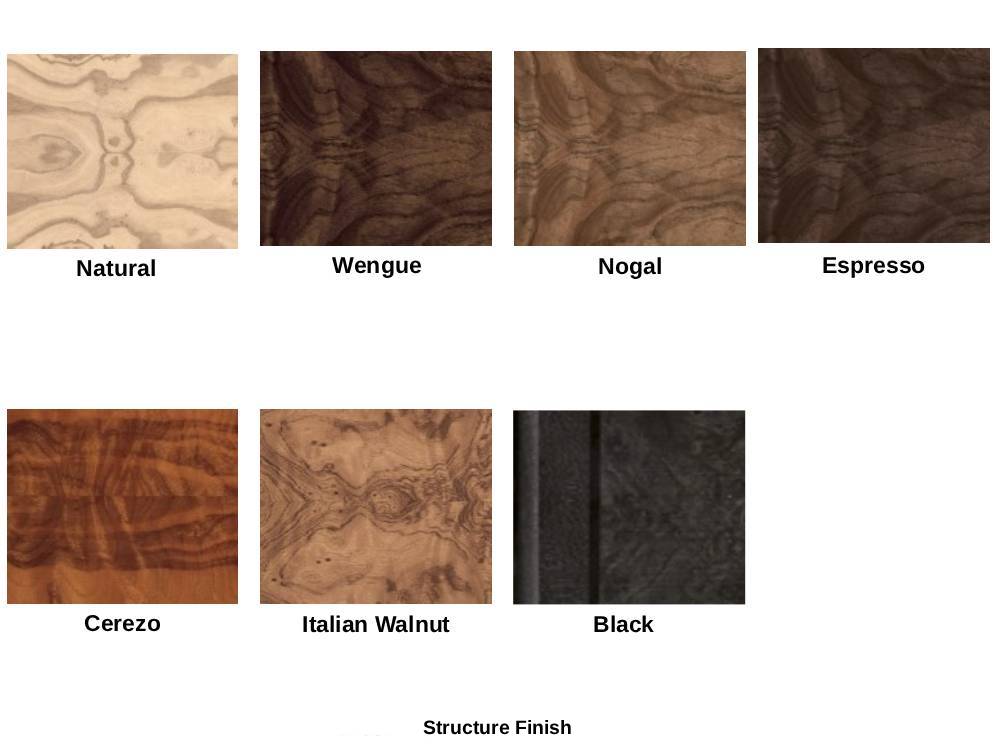 • Structure, Shelves and Doors Finish: Natural, Wengue, Nogal, Espresso, Cerezo, Italian Walnut, Black.