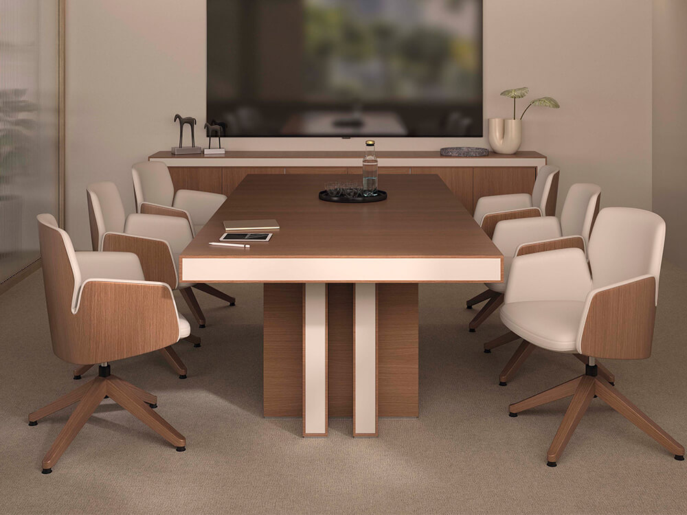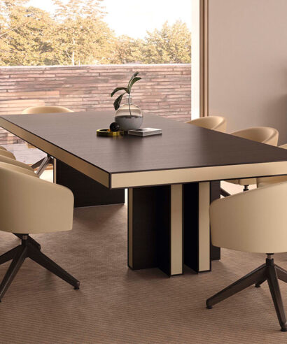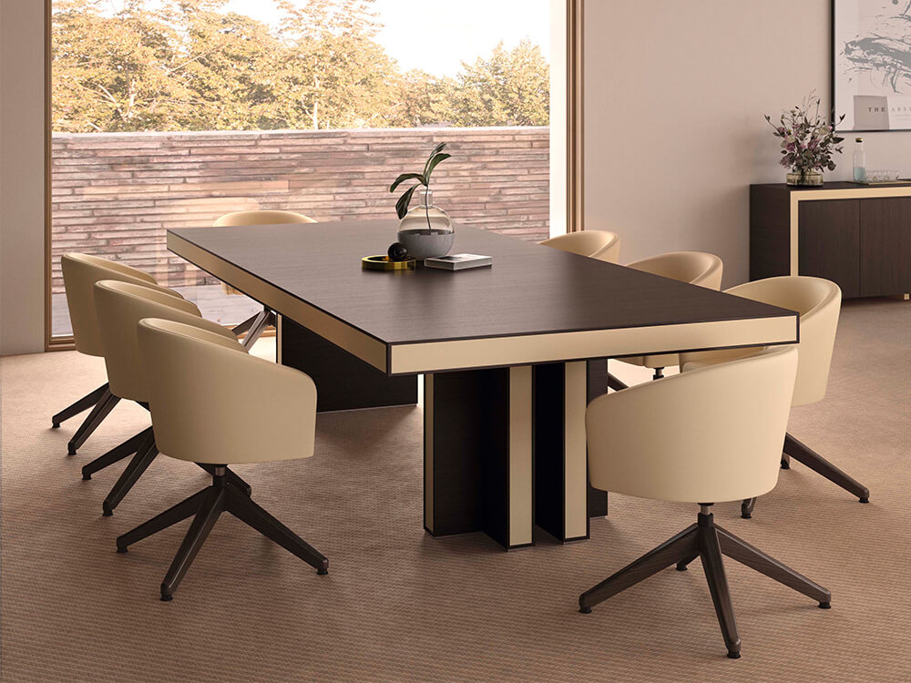 The pure lines in the wood and multiple lacquered combinations create a new, refined office interior design that is full of serenity and balance