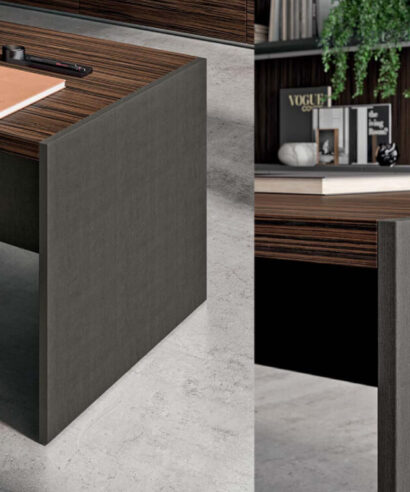 Einyais a modern executive office desk with panel legs, which enhances the look. The wood veneered top can be complemented with a leather inlay as well as a return with a pedestal. Organise your desk with a variety of cable management options