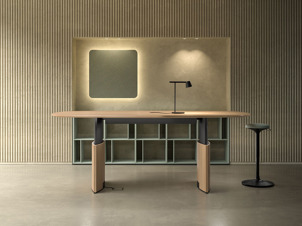 The Elvira 2 Electric Height Adjustable Meeting Table is a premium Italian-designed solution for modern workplaces. Crafted with a sturdy 30 mm MDF top, veneered on both sides and edged with solid veneer, it offers strength, durability and elegance. Available in both rectangular and barrel shapes, the table is equipped with an advanced electric height adjustment system, allowing effortless shifts between seated and standing positions. Presented in a wide selection of high-quality materials, it is designed to complement a variety of professional interiors. Ideal for offices, boardrooms and collaborative spaces.