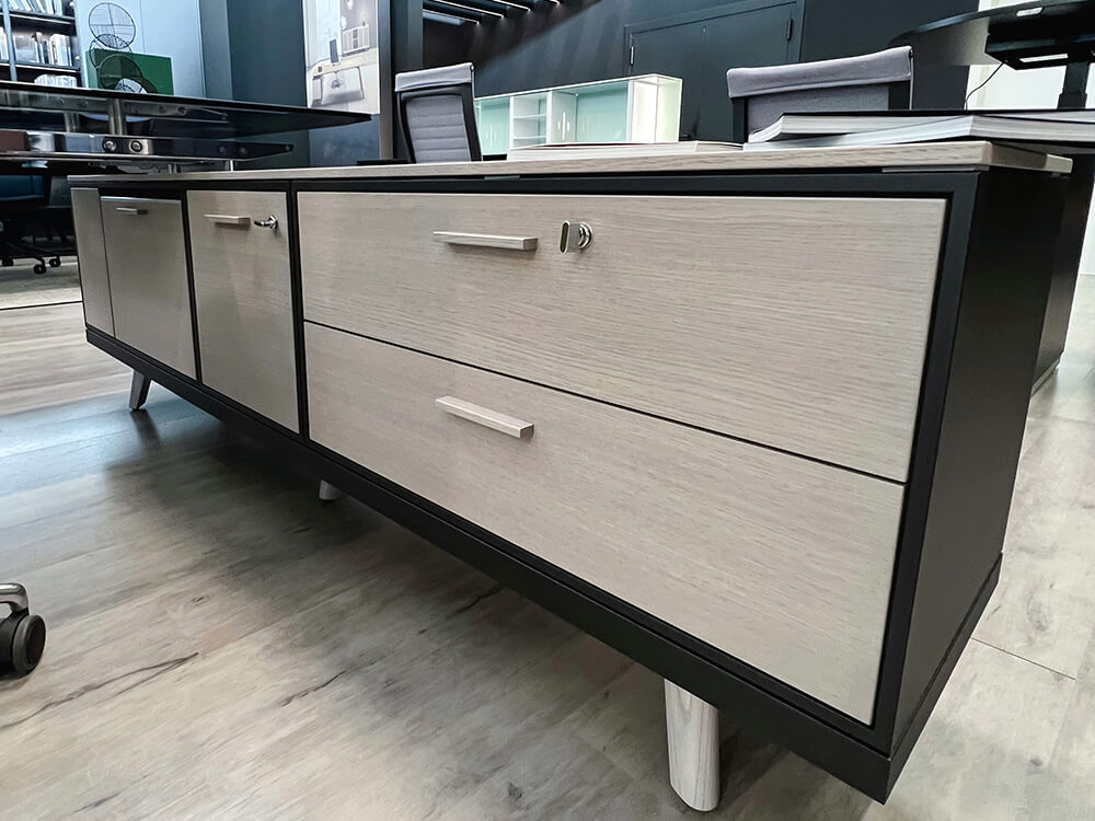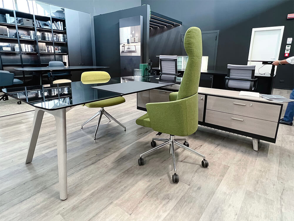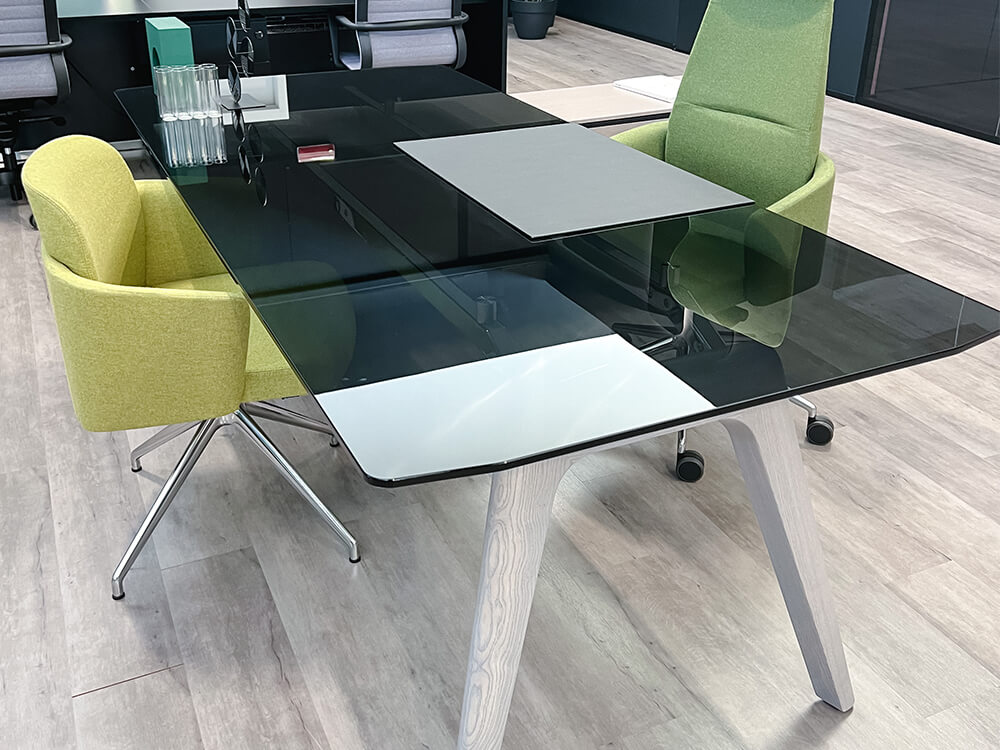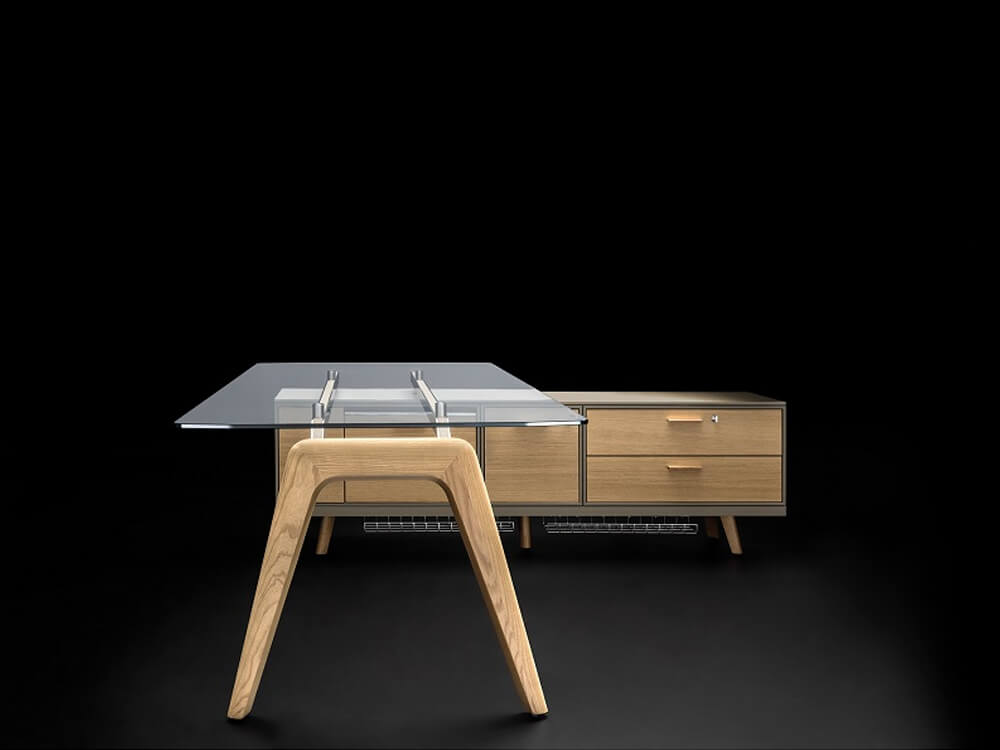 Reine, crafted by Perin and Topan, stands as an elegant executive desk featuring a glass top design with sturdy, solid wood legs. If additional storage space is required, seamlessly integrate a credenza unit on either the left or right side, available in a range of exquisite wood veneer finishes. Conceal cables effortlessly with our range of cable management solutions.