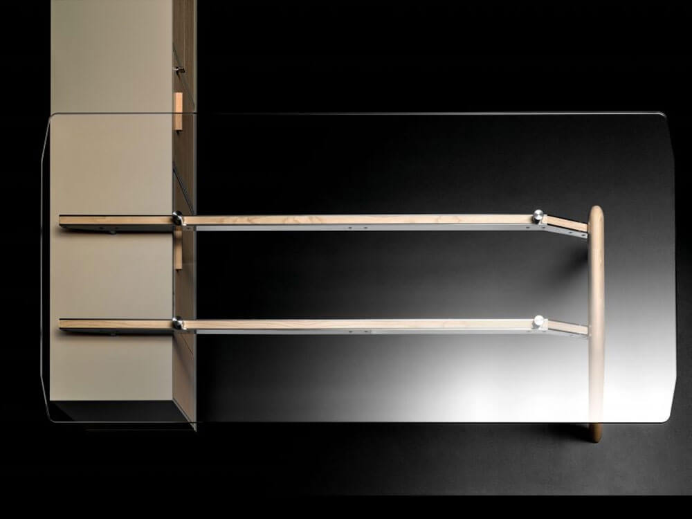 • Desktop: Made of 12 mm-thick clear tempered glass. Rounded flush clear edge. The tops are fastened to the chrome-plated metal pedestals underneath through 32 x 35 mm cylinder metal spacers.