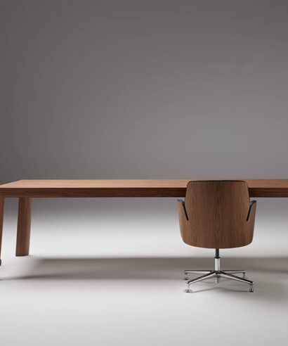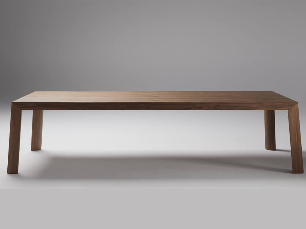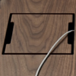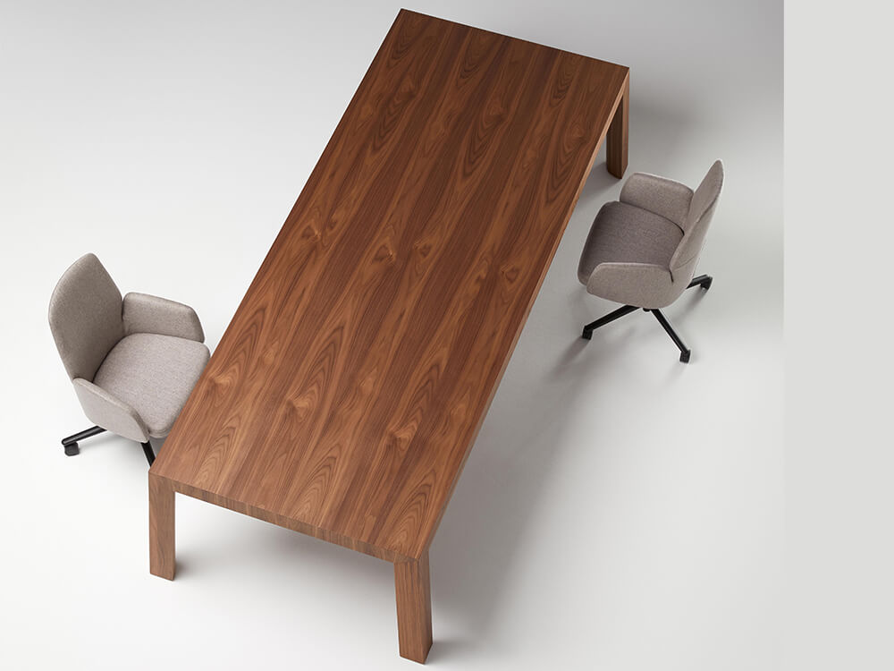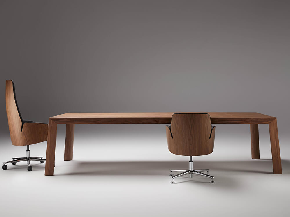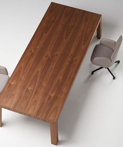 - Legs: The inclined legs are made of 110 mm thick 675 kg/m3 MDF fibre board and American walnut veneer with a vacuum membrane curved on the inside with a 100 mm radius and at a 90 ° angle on the outside. These legs have a trim to hide the rise of the cables through magnets and regulators for the correct levelling of the table.