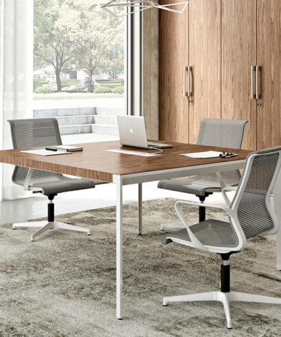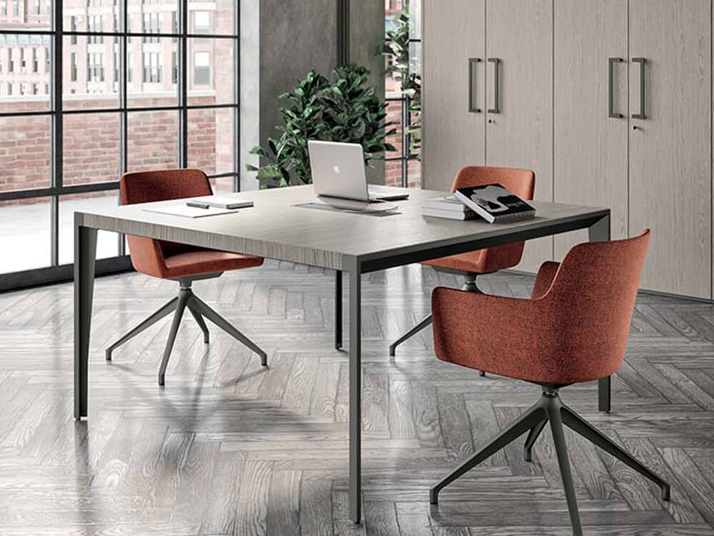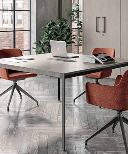 The Xandy 1 is a sleek Italian design crafted for modern offices, available with or without an elegant leather inlay. Its 18mm veneered MDF top with precision folded edges highlights premium craftsmanship, while the epoxy powder-coated steel frame provides strength and stability. Offered in refined wood finishes such as Elm, American Walnut, and Ebony, with leg options in Matt White or Umbra Grey, this table comfortably seats four and brings a perfect balance of style and function to meeting spaces.