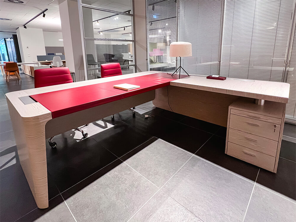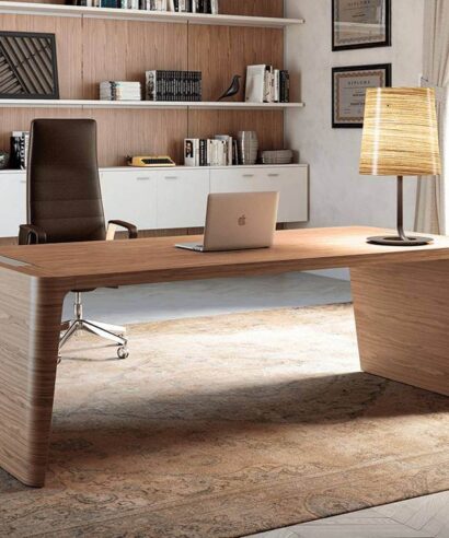 This sophisticated desk features an 18mm veneered MDF top with matching wood veneer edges, and it offers an optional leather inlay. The desk is supported by a sturdy frame made from epoxy-coated steel tubes. It includes a pedestal with three drawers and one pen drawer, all equipped with soft-close mechanisms and central locking for added security. A matching modesty panel enhances the desk’s clean and elegant design. It is available in finishes of Elm, American Walnut, and Ebony.