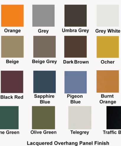 - Lacquered Overhang Panel Finish:Â White, Grey, Shadow Grey, Orange, Grey white, Telegrey, Silk Grey, Beige, Beige Grey, Golden Yellow, Flame Red, Purple red, Sapphire Blue, Pigeon Blue, Traffic Black.