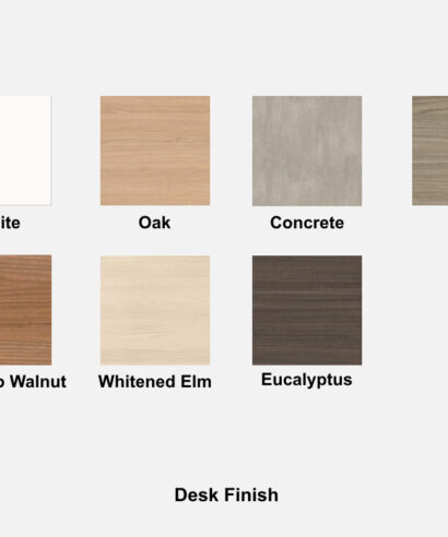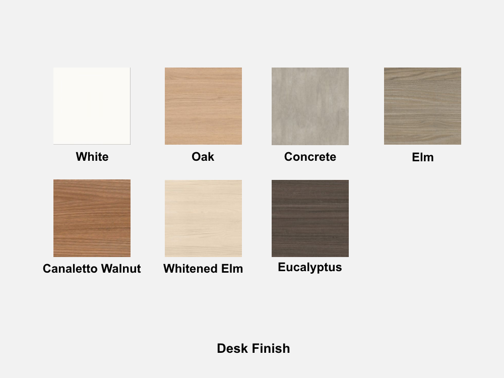 - Desk Finish:Â White, Eucalyptus, Oak, Canaletto Walnut, Elm, Whitened Elm, Concrete.