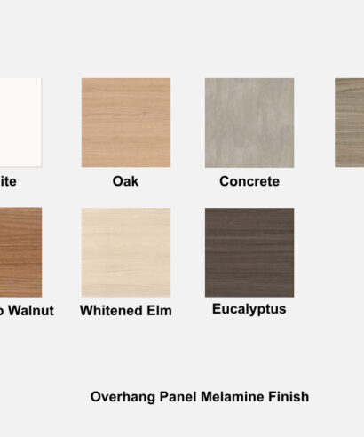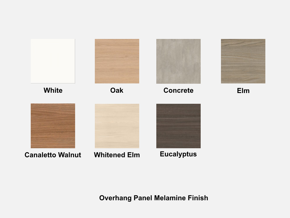 - Melamine Overhang Finish:Â White, Eucalyptus, Oak, Canaletto Walnut, Elm, Whitened Elm, Concrete.